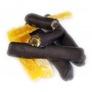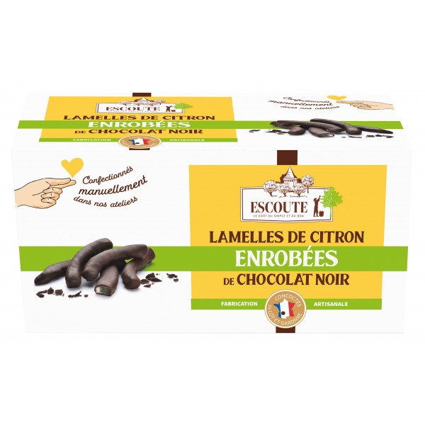Ballotins de lamelles d'écorces confites de citrons enrobées de chocolat noir 180gr.