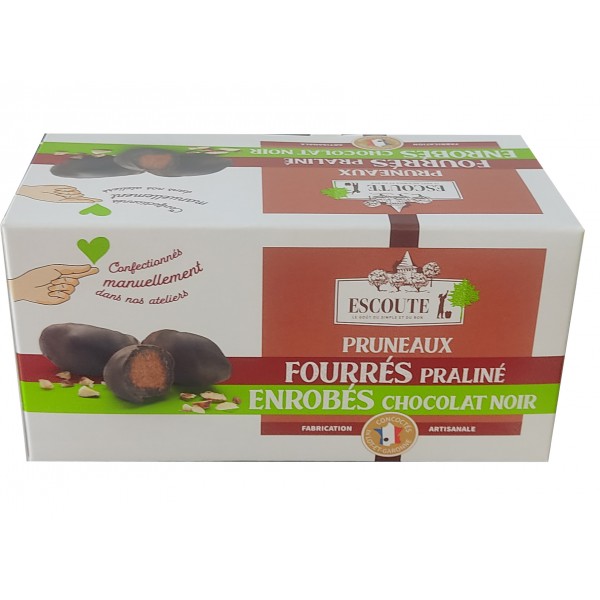 Pruneaux d'Agen fourrés au praliné, enrobés de chocolat noir 70% cacao, ballotin de 240g